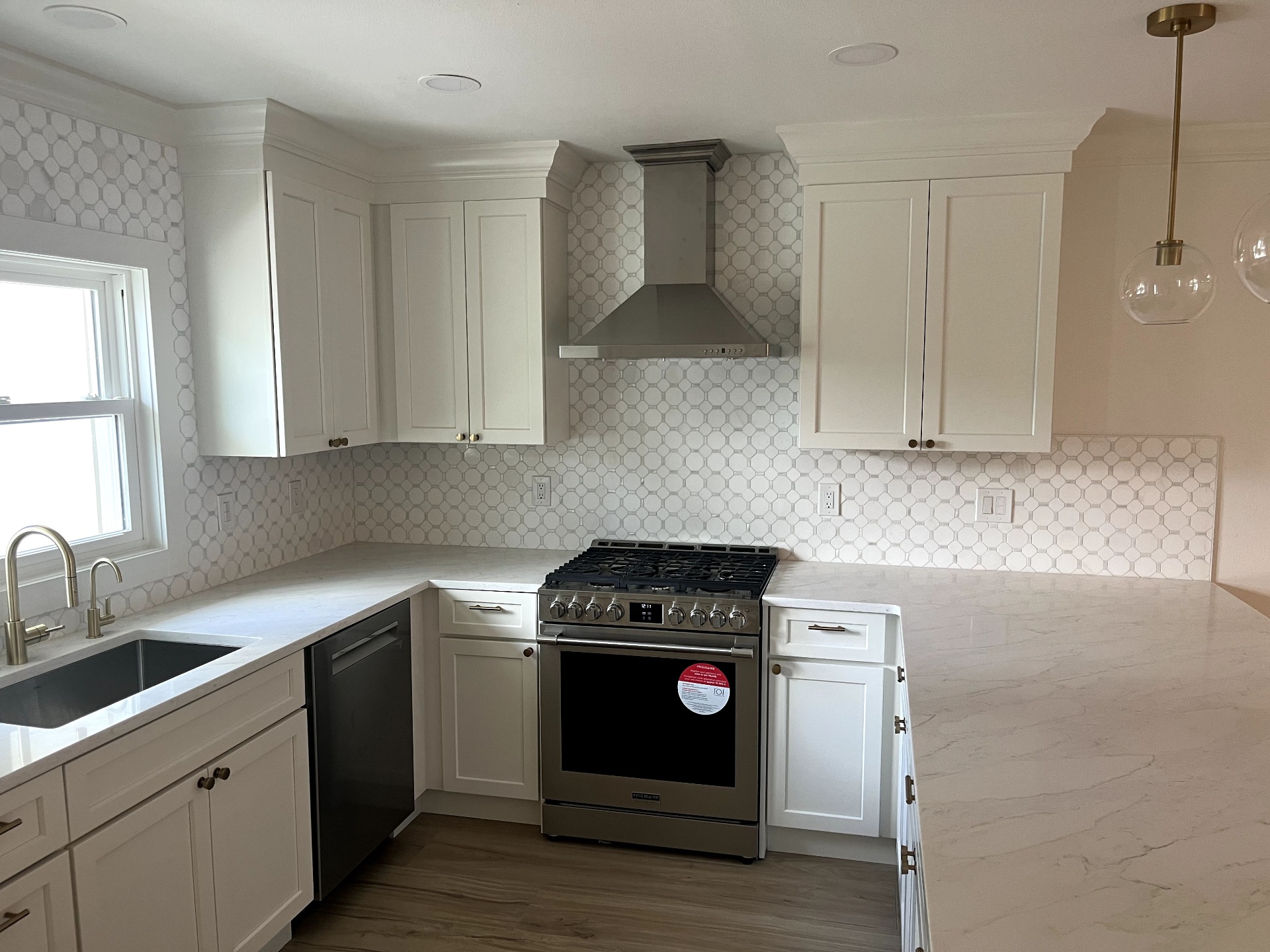 After completing essential electrical work due to flooding, we installed all-new kitchen cabinets and countertops, added a modern tile backsplash, and upgraded to a gas range with proper exhaust venting for improved cooking performance.